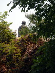 歩いていると、右手の山際に真白い青年大師像が見えてきた。右手に杖を持った弘