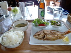 昼食は海が見えるレストラン。地魚の唐揚げ定食を注文し、珍しくノンアルコールビ