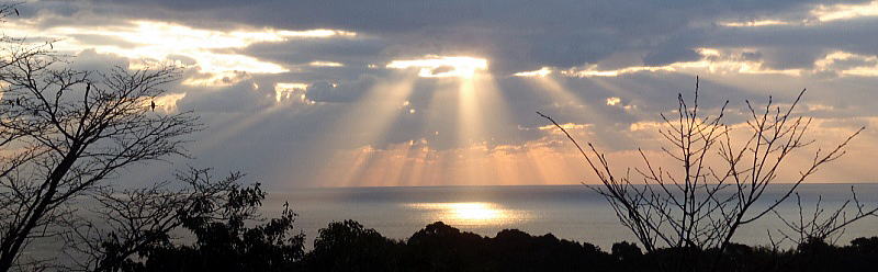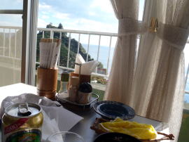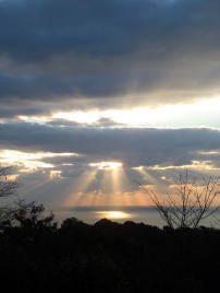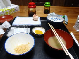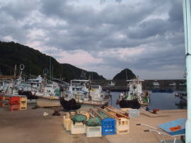 6時30分から朝食。食堂の窓から漁港が見え、その向こう、防波堤のかなたの水平線に太陽が昇ろうとしている。が、厚い雲が光をさえぎる。雲間を通して紅い筋が射し込むだけだ。それでも十分にきれい。