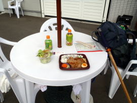 意外にいいお昼でした。コンビニの広々とした駐車スペースの一角にしつらえられた白いテーブルとイス。秋晴れの山をみながらのんびりとしょうが焼き弁当を食す。