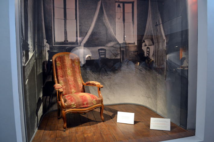 ▲ベルナデッタが亡くなるときに座っていた肘掛椅子。背景写真の右端のベッド(十字の印がついている)が彼女のもの。 |