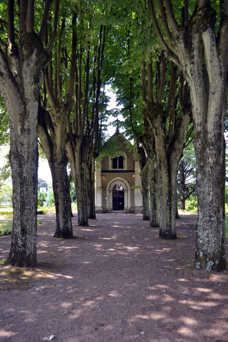 庭をぐるりと一周して元に戻る手前に小さな建物がある。アーチ形の入り口、とがった屋根に十字架、そして建物の前には並木道が天高く緑の葉を茂らせている。