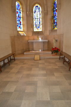 開け放たれたドアを入ると正面に祭壇があり、上方にはマリアを描いたステンドグラスが白い輝きを放っている。その左と右にも同じ大きさのステンドグラス。あとは壁に沿って木のベンチが置いてあるだけの質素なしつらえだ。