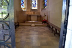 前面のアーチ型開口部には低い柵が設けられ、その向こうに、ステンドグラスから漏れる光のもと、がっしりとした木製台の上に棺が置かれている。