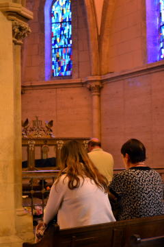 柵の前にひざまずき、棺の中のベルナデッタに祈りをささげる男性がいる。彼はたぶん祈りの言葉を口にしているのだろうが、その低い声でも届きそうなほど、ベルナデッタの棺は近い。ひざまずけば目の前にベルナデッタがいる、そんな感じだ。