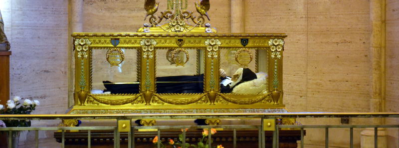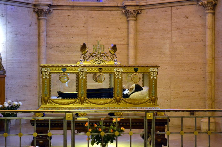 棺には正方形の3枚のガラスがはめ込まれ、横たわる人物の姿がはっきり見える。35歳という若さで亡くなった聖ベルナデッタの遺体だ。黒い修道服をまとい、まるで眠っているかのようなその顔は、130年余の時を超えて生き続けているようにも思えた。