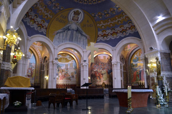 中に入るとひときわ目を引くのが鮮やかな色彩のモザイク画。正面の円天井には両手を広げた聖母マリアと大勢の天使が描かれている。この円天井は天国を表しているとか。