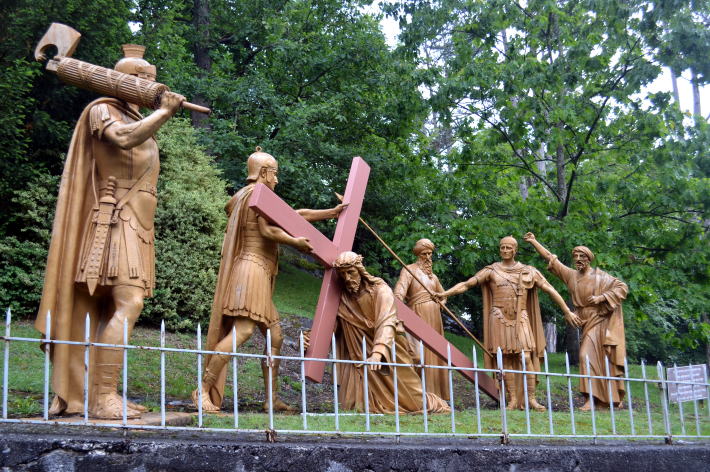 一時強かった雨は少しずつ小降りになってきた。傘をさしながら5分ほど歩くと、十字架の道行の最初の場面が現れた。