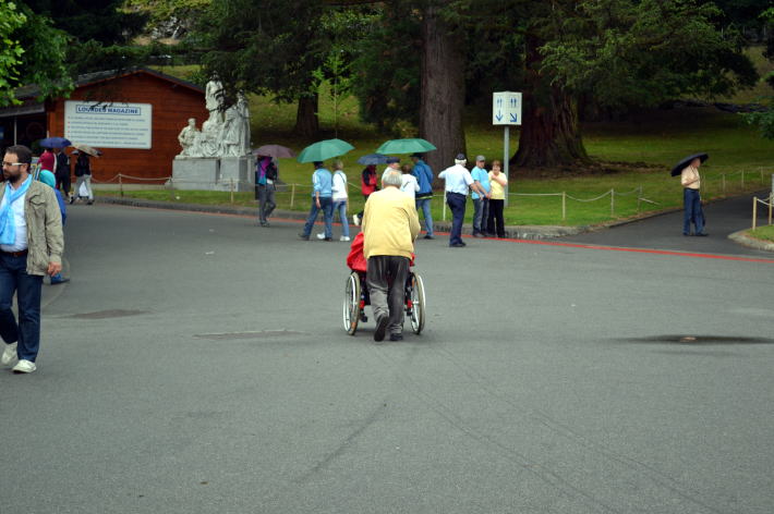 5時、十字架の道行を終え、山を下りる。聖域を通って修道院に戻る途中、車いすの老夫婦に出合った。雨合羽をまとった奥さんが濡れないように、ご主人が合羽のすそをなおす。その様子がいかにもやさしそうで、こころがなごんだ。