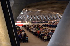回廊はゆるやかなスロープになっており、下りていくと、その広さに圧倒されるような巨大なフロアに出る。中央に祭壇、その周囲を無数のベンチがとりまく。そこだけを見ると、規模は大きいがやはり教会の雰囲気をただよわせている。