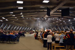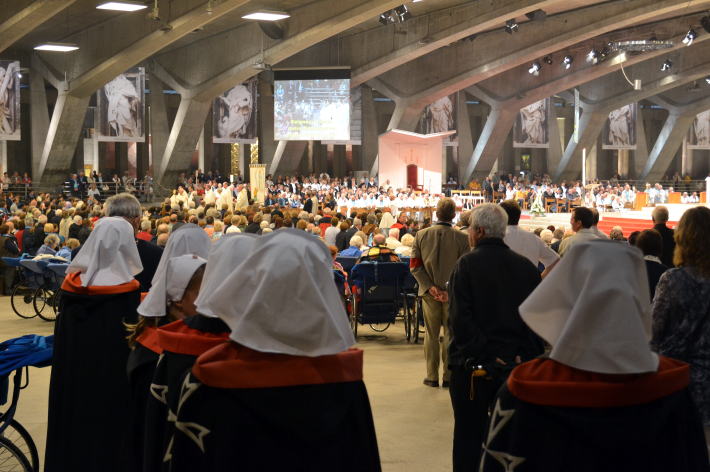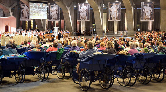 車いすの人がずらりと並ぶ一角がある。同じ色のTシャツを着た一団がいる。さまざまな国のさまざまな人たちが祈りをささげていた。