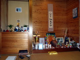 部屋に通される。民宿用の部屋ではなく、西銘家の台所の隣にある6畳の部屋だった。いつもはだれか家の人が使っているのだろう。床の間と押入れを改造した棚に、おびただしい数のお供え物(?)が飾られていた。見れば絵や書、仏像、天使の彫像、パワーストーンに千羽鶴……などなど。これはいったいなんだ?