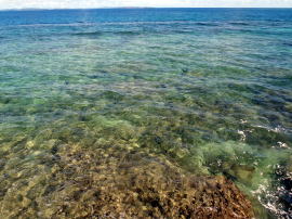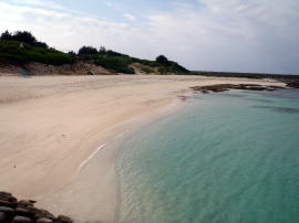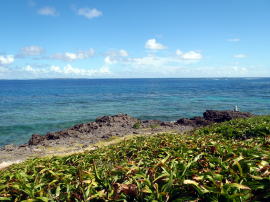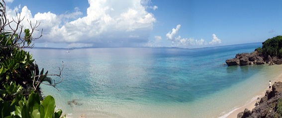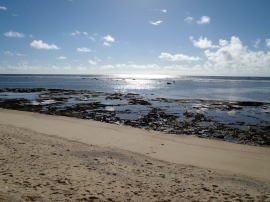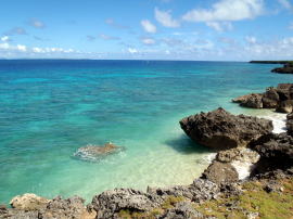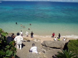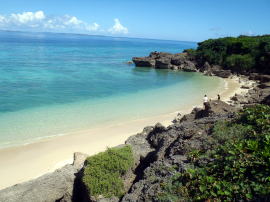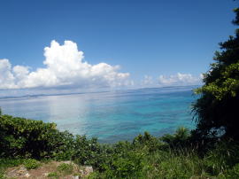 浜に出てみる。いい天気だ。空は青く、海もまた青い。白い砂浜の先には潮が引いて顔を見せている岩礁。沖合で波が砕けて白い線を描いているのはリーフ。その手前と向こうとでは海の色がはっきり異なっている。