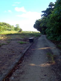 道の右側は林。防風林の役目をしているのだろう。うっそうとした木立の向こうから波の音がかすかに聞こえる。左は幅50メートルぐらいの畑が道路沿いに連なっている。所どころにある雑草が生い茂った区画は、耕作放棄地だろう。