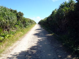 さて、拝巡は島の東側の外周道路から行くことにした。久高島は南北に細長く、東側と西側に周回道路がある。さわを出てしばらく行くと未舗装の細い道路になる。軽自動車がぎりぎり通れるぐらいの道幅だ。