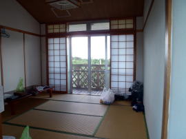 8畳の和室。大きいテーブルがぽんと置いてあるだけの簡素な部屋。清潔だしこれで十分。干渉もまったくなしの様子だから、願ってもない宿だ。
