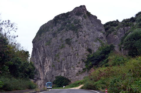 道路脇にそびえる大和ブー大岩。高さは約15メートル。案内板の地図にはここから牧山展望台まで行く近道が描いてあったので、岩の右手に見える林の中に入ってみた。