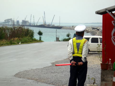 今日は工事車両の出入りも少なくてヒマそう。2年後には立派な橋が完成するそうなので、できあがったら車で海を渡ってみたいものだ。 |
