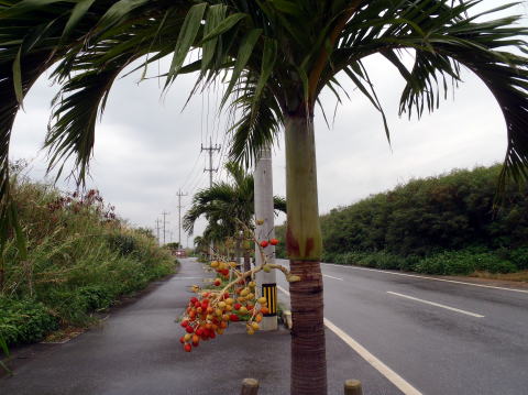 歩道に植えられているヤシ。名前はマニラヤシというらしい。熟した実がついていた。赤い実をもいでみたが食べられそうにもない。投げ捨てるとゴムまりのようにはずんでいった。
