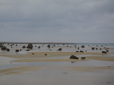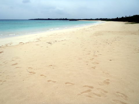伊良部島の渡口の浜は、宮古島の前浜ビーチと甲乙つけがたいほどのすばらしさだった。晴れていればもっと色鮮やかな白とブルーが見られたのに、それだけが残念だ。 |