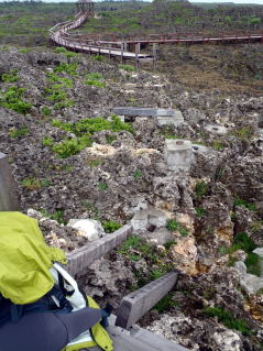 右と左に池を見ながら進むと、すぐにウッドデッキの木道になる。どうやら鍋底まで続いているようだ。しばらく歩くと、その木道が壊れている。しかたなく岩場に下りて歩き、続きの木道によじのぼる。