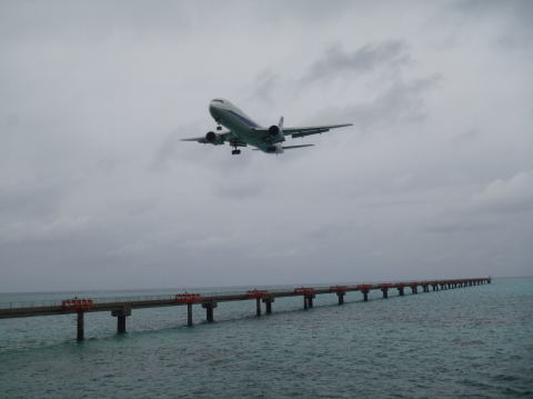 下地島空港の滑走路は3000メートルもある本格的なもの。飛んでくる飛行機も巨大だ。着陸態勢に入っているから、飛行機は頭のすぐ上を通過していく。すごい迫力。