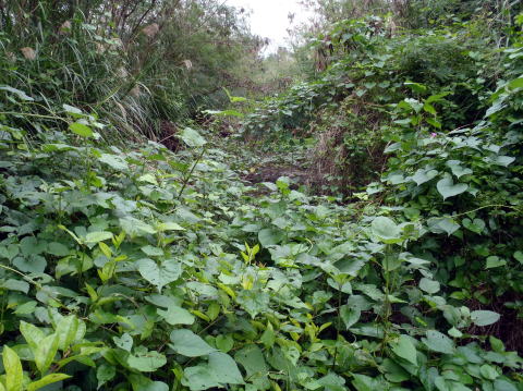 草を踏み分けると下は固い。道の両側から延びてきたつる草でジャングル化しているが、この草の下は間違いなく舗装道路なのだ。