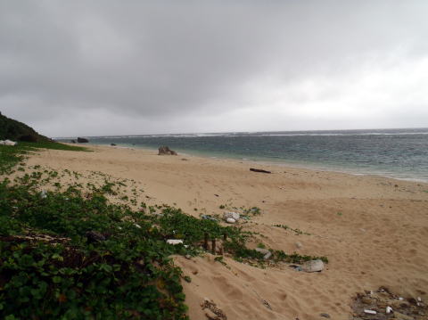 海岸へ降りる坂道を数分歩き、砂浜に出る。人っ子一人いない砂浜は、雨にぬれて本来の白さを失い、ただただわびしく広がっていた。