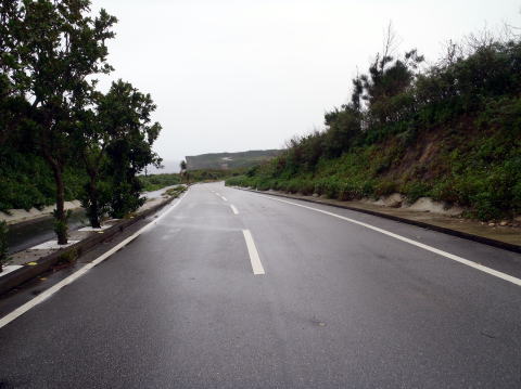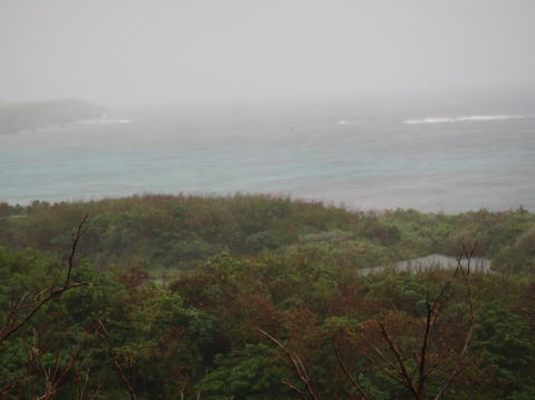 今日は東海岸沿いの83号線をひたすら歩き、東平安名崎まで約10キロ。それから南海岸に出て13キロだから、合計23キロの予定だ。ずっと雨だとけっこうきつい。 |