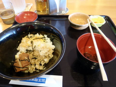 昼食のラフテー丼。735円なり。海宝館のレストランは団体客が入れるようにかなりの広さがあった。そんなレストランでひとりだけの昼食。なんだかわびしくて食が進まず、ラフテー丼を残してしまう。 |