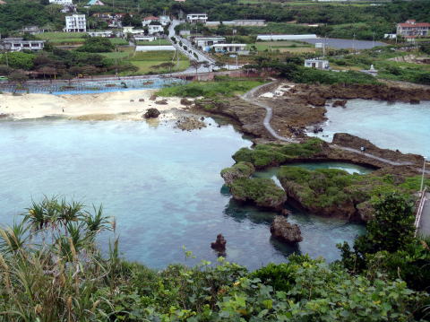 展望台のある丘の方向から見下ろしたマリンガーデンの入り口。岩場の遊歩道の向こう側が入り口だ。 |