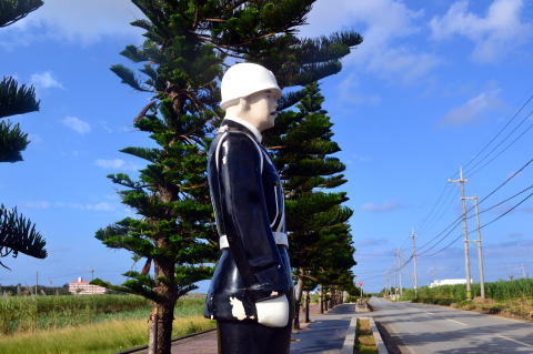 遠目に警官、近寄ってみると、かの有名な「宮古島まもる君」だった。来間大橋はまだ遠いのでしょうかね。 |