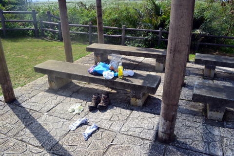 展望台で昼食。靴や靴下はマメに乾かすこと。快適な歩きの必須条件だ。 |