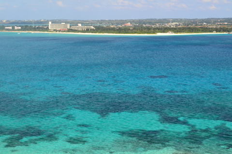 竜宮展望台から見た対岸の前浜ビーチ。白い建物は宮古島東急リゾート。海の色がなんともいえないほどきれいだ。