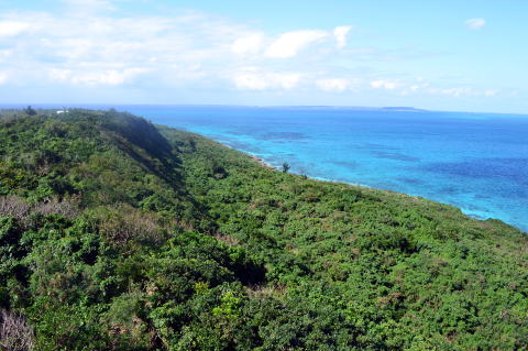 伊良部島方面。原生林の緑と海の青さが、離島の雰囲気をかもしだしている。人の気配が感じられないという景色も、なかなかいいもんだ。