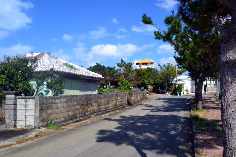 展望台から元の道路に戻り、人通りのない島の道を歩く。少しいくと、来間島いちばんの観光スポット、竜宮展望台に着く。