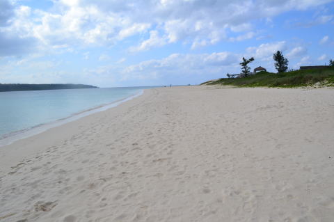 与那覇前浜ビーチの砂浜。さっきまではしゃいでいた修学旅行の高校生たちがいなくなると、浜辺は静かな波の音だけになる。 |