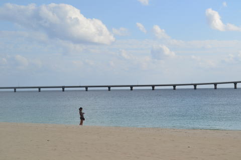 歩いている人は皆無。車もほとんど通らない。全長が1690メートルの来間大橋を歩く。