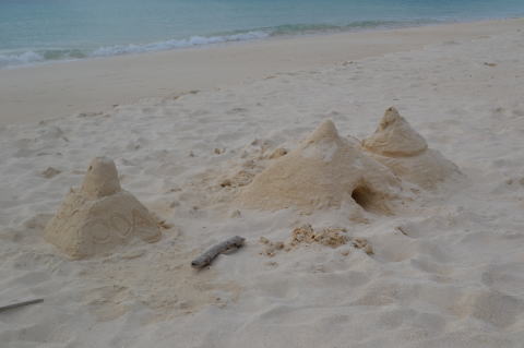 高校生たちがつくっていた砂山。もう少し潮が満ちれば消えてしまう。 |