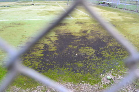 下地地区公園のテニスコートはけっこう荒れていた。使う人が少ないのだろうが、苔のようなものがはびこっている。冬でもあったかいし、湿気も多いのだろう。あ〜もったいない。 |