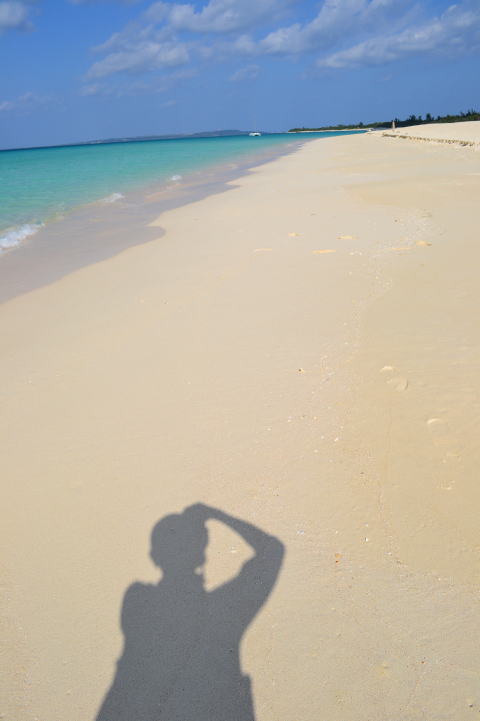 ほんの数分歩いて、前浜ビーチに続く砂浜に出る。雲もほとんどなくなり、晴れてきた。砂の白さが目に痛い。サングラスは必携品だ。午前中はこの砂浜をずっと歩き、突端の西浜崎を回りこんで与那覇湾沿いに空港まで行く予定。サングラスでもまぶしすぎるかなあ。