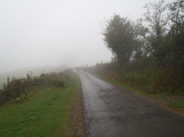 ▼気合を入れて歩き始めたが、雨と霧で見通しは悪い。前を行く巡礼者の姿もかすんで見える。