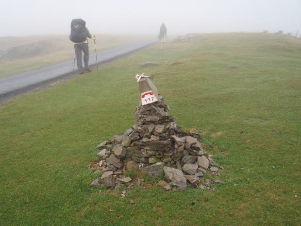 ▼霧が深い。このあたりは山というより草原のような雰囲気だ。道路わきの石積みは巡礼者が積んでいったものだろう。電話マークの下の「112」は、EU加盟国共通の緊急電話番号。