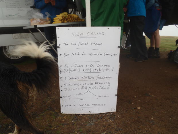 ▼この案内の「BUEN CAMINO」を見て、巡礼者を歓迎している人たちのサービスだと思ったのだ。案内書の下のほうに日本語発見!「フランスの最後のスタンプだよ!!