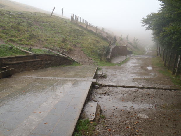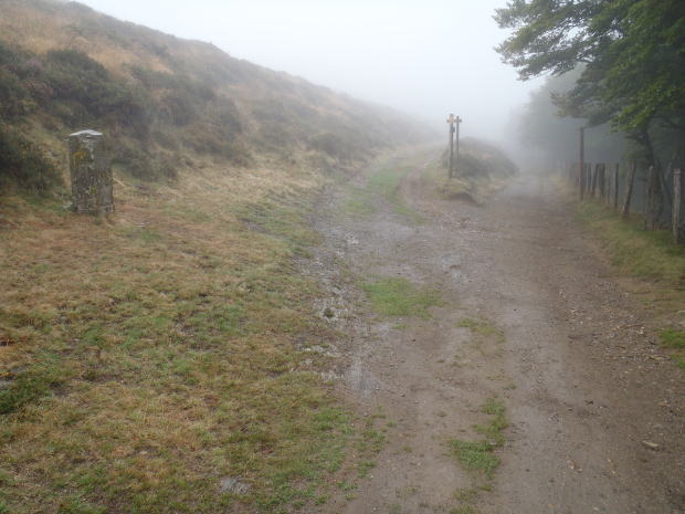 ▼この十字架が旧道への分岐の目印だという。雨は小降りになったが、霧はあいかわらず濃い。晴れていればすばらしい眺望が望めるのだろうが、ま、雨のピレネーもまたよし、としよう。