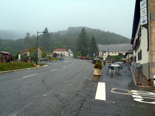 ▼雨にぬれるロンセスバージェスの町。左端に巡礼者が2、3人見えるが、そこが巡礼路だった。
