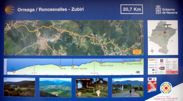 ▼巡礼路に掲げられた案内図。スビリまで20.7km。わたしは3kmしか歩かないつもりだが、これが平均的な一日の行程なんだろうな。高低差はそれほどなく、わりと平坦な道のようだ。