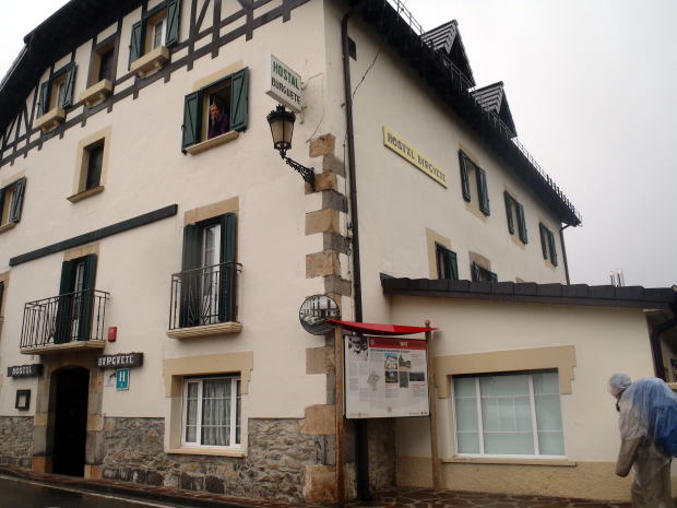 ▼ヘミングウェイの定宿だった「オスタル・ブルゲーテ」。ガイドブックに載っていたこの宿に泊まってみたいという思いもあり、今日は3kmでやめにしよう決めたのだ。そして、ヘミングウェイがマス釣りに興じたという川辺を散策でもすれば、気力も回復するだろう――なんて思っていた。でも、この雨だ。部屋にこもっているしかなさそうだし、もう少し先まで行ってみようか。