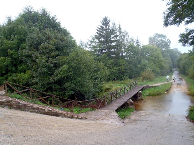 ▼10分足らずでブルゲーテの町をぬけると、旧道に入る。小川を越え、林を通り、牧草地を縫うように歩いていく。雨はやまない。標高が高いせいか肌寒lく、少しずつ濡れていく体が冷える。