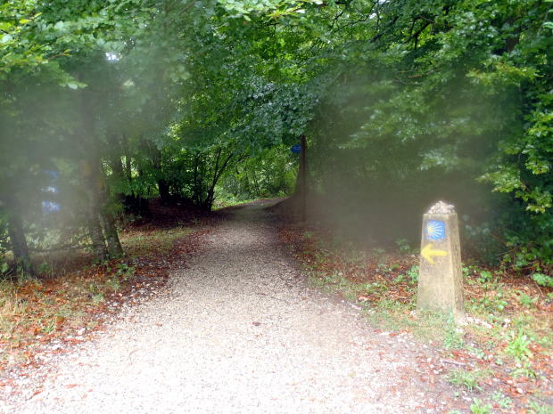 ▼雨音だけが聞こえる森の小道。ひとりで歩いているときは、ホタテ貝のマークと黄色い矢印を見つけると、心の底からホッとする。このころは、レンズに雨がつくほど降っていた。おかげで写真がボケてしまった。